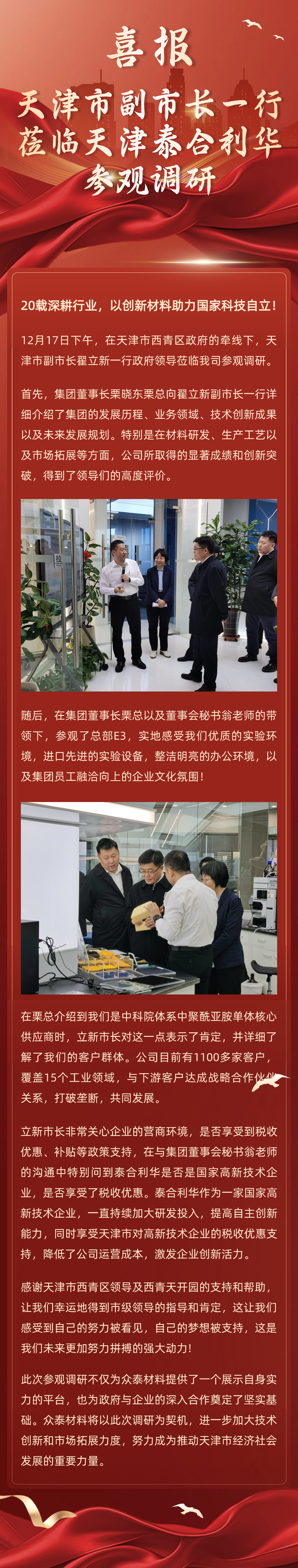 12月17日下午,在天津市西青區(qū)政府的牽線下,天津市副市長翟立新一行政府領(lǐng)導(dǎo)蒞臨我司參觀調(diào)研。